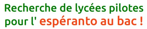 Dans le cadre du projet « espéranto au bac », l’Institut français d’espéranto (Franca-Esperanto-Instituto, FEI), en collaboration avec Espéranto-France et SAT-Amikaro, recherche des lycées pilotes pour proposer des cours d’espéranto en vue de la future épreuve d’espéranto, langue facultative au baccalauréat.