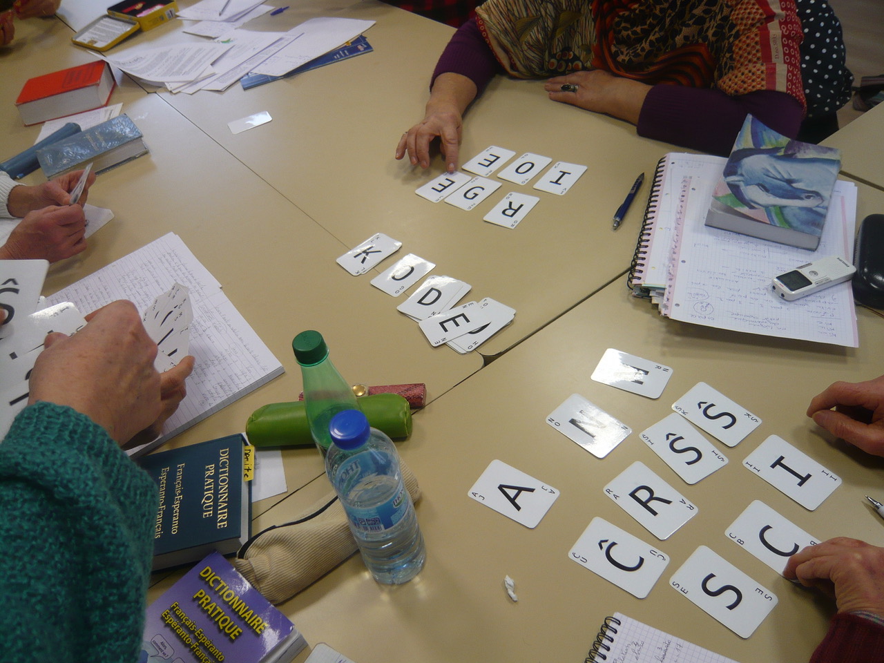 52 participants de toute la Bretagne se sont retrouvés à la Maison Départementale des Associations pour un stage d’espéranto de deux jours sur le thème du jeu proposé par Armor-Esperanto. Les 13 débutants étaient guidés par Alain Bournel, qui a utilisé pour l’occasion la méthode de Claude Gacond (affiches). Plusieurs d’entre eux vont poursuivre l’apprentissage, seuls ou en club. Le deuxième niveau était constitué de 21 espérantistes désirant améliorer leur oral grâce à un atelier de simulation globale animé par Élisabeth Le Dru, de Vannes. Au troisième niveau, composé de 15 enseignants, Laurent Peuch a présenté les jeux découverts lors d’une formation Erasmus + ce printemps. Thèmes des jeux : comment rompre la glace en début de cours, le vocabulaire, la grammaire, la prise de parole. Parmi les enseignants, A. Desormeaux, M. Caré, P. Stride et J. Caré ont proposé des jeux qu’ils utilisent avec leurs élèves en école primaire, collège, foyer de jeunes travailleurs et école d’ingénieurs. La plastifieuse a beaucoup fonctionné, les participants sont repartis avec des planches prêtes à découper. (Info : Jérôme Caré).